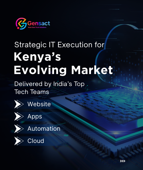 Gensact, one of India’s top IT companies, brings a structured, high-performance approach to technology services for Kenyan businesses. We deliver a full stack of solutions custom CRM and ERP development, mobile and web applications, enterprise cloud deployment, cybersecurity, automation, managed IT support, digital marketing, and advanced SEO. What makes our work stand out is how we deliver: every project is built through a consultative model, deep requirement mapping, scalable architecture planning, and rigorous quality engineering. Our teams work in streamlined sprints, ensuring faster execution, transparent communication, and measurable outcomes. For companies across Nairobi, Mombasa, Eldoret, and Nakuru, Gensact acts as a long-term technology partner strengthening operations, accelerating digital growth, and enabling Kenyan brands to compete confidently on a global stage.